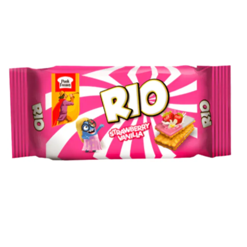 Peek Freans Rio Strawberry Vanilla delights with crunchy biscuits and smooth strawberry-vanilla cream, creating a tasty, fun treat for all ages